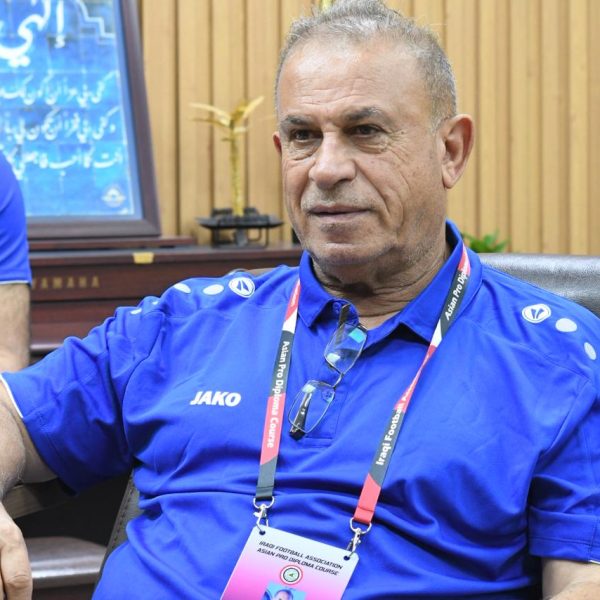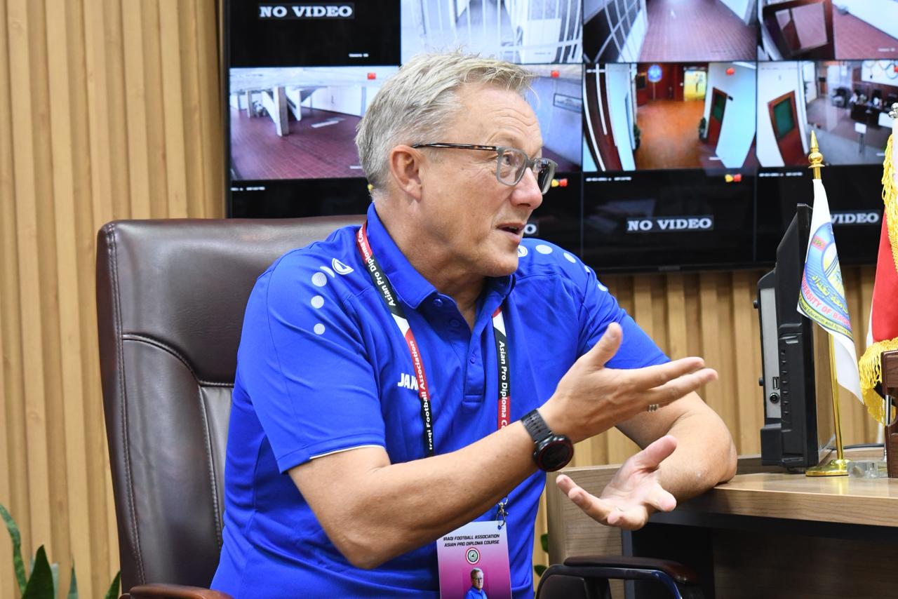 The Dean of the College of Physical Education and Sports Sciences at the University of Baghdad, Prof. Sabah Qasim Khalaf, received FIFA-accredited international instructor Simon Jenkins on the sidelines of the opening ceremony of the Asian Pro License Course, in the presence of Dr. Wisam Najeeb Asliywah, Director of Coach Education and Development at the Technical Committee of the Iraqi Football Association, and instructor Abdulrahim Hameed.