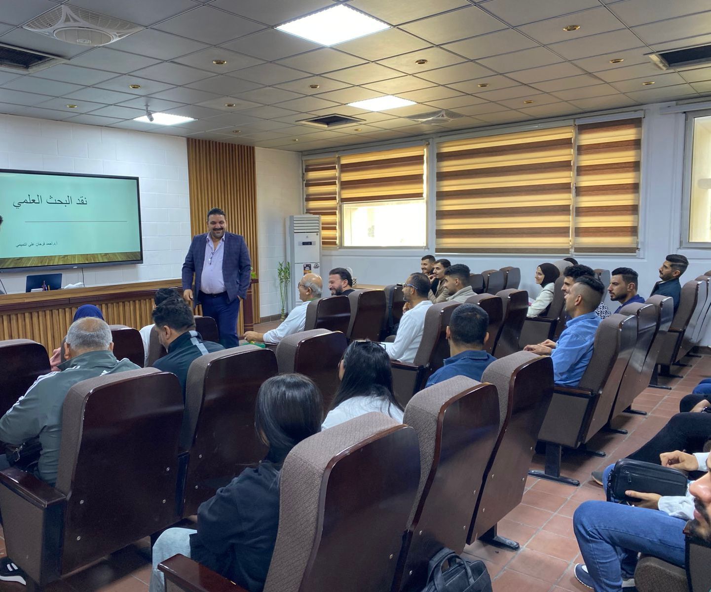 The College of Physical Education and Sports Sciences at the University of Baghdad (Postgraduate Studies Division) organized a workshop titled “Scientific Research Critique,” delivered by Prof. Ahmed Farhan Al-Tamimi, a specialist in scientific research.